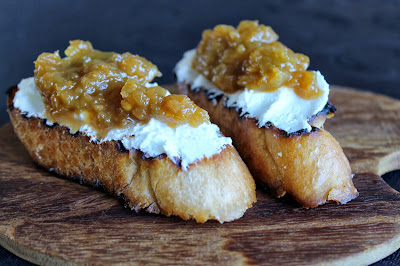 Jeg havde en del grønne tomater at eksperimentere med i år, og der var for mange til kun at lave syltede grønne tomater. Så i år prøvede jeg at lave en grøn tomatmarmelade - en opskrift som jeg har haft kig på i flere år, men aldrig rigtig har fået taget mig sammen til at lave. Opskriften er fra Killes Køkken, en kogebog som efterhånden har 12-13 års jubilæum i mit køkken, og som jeg holder meget af. Jeg var ikke synderligt imponeret over den grønne tomatmarmelade da jeg skulle smage den til, men da jeg lavede disse hapsere med cremet gedeflødeost og den let røgede marmelade, var jeg solgt... Sikke en mundfuld!